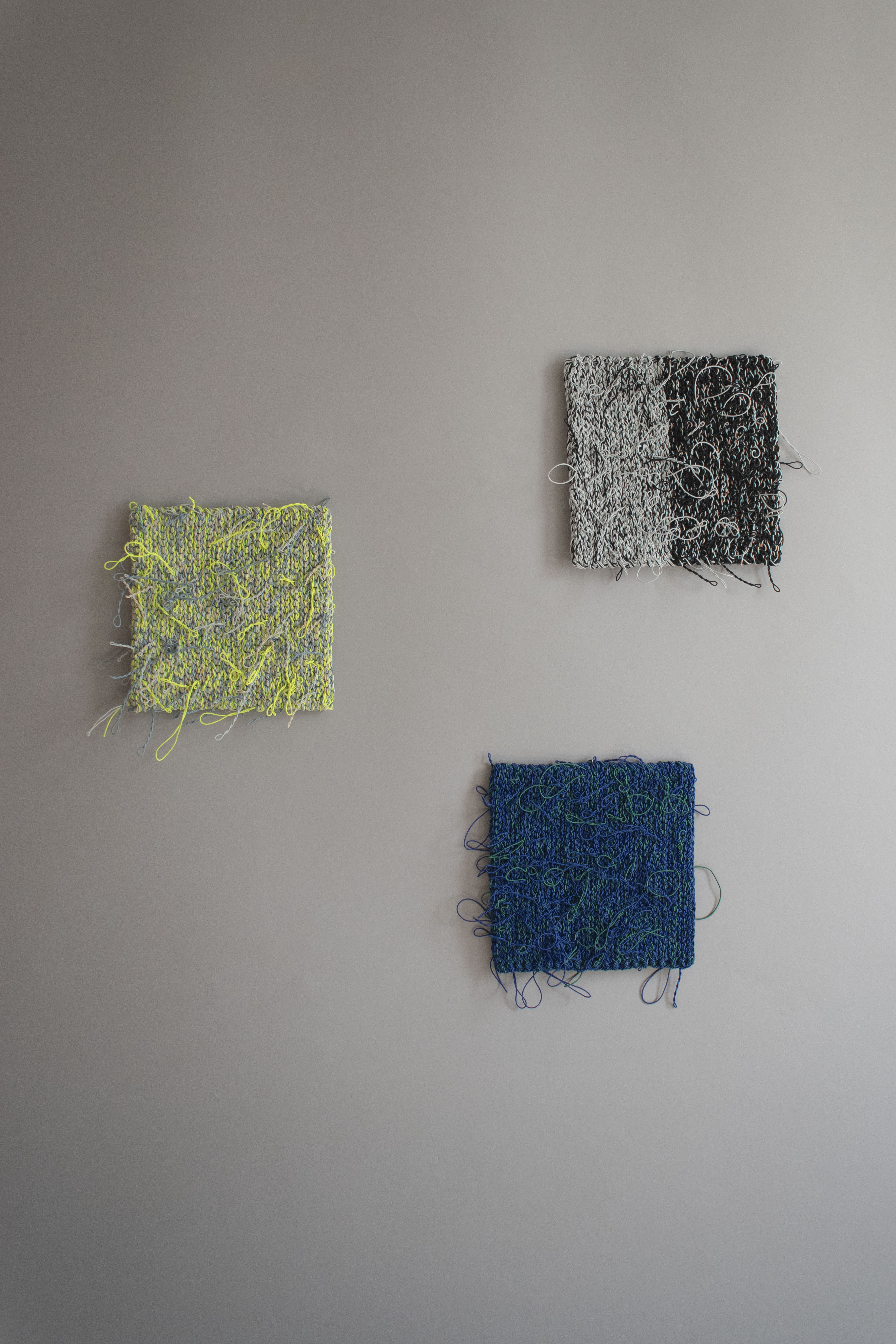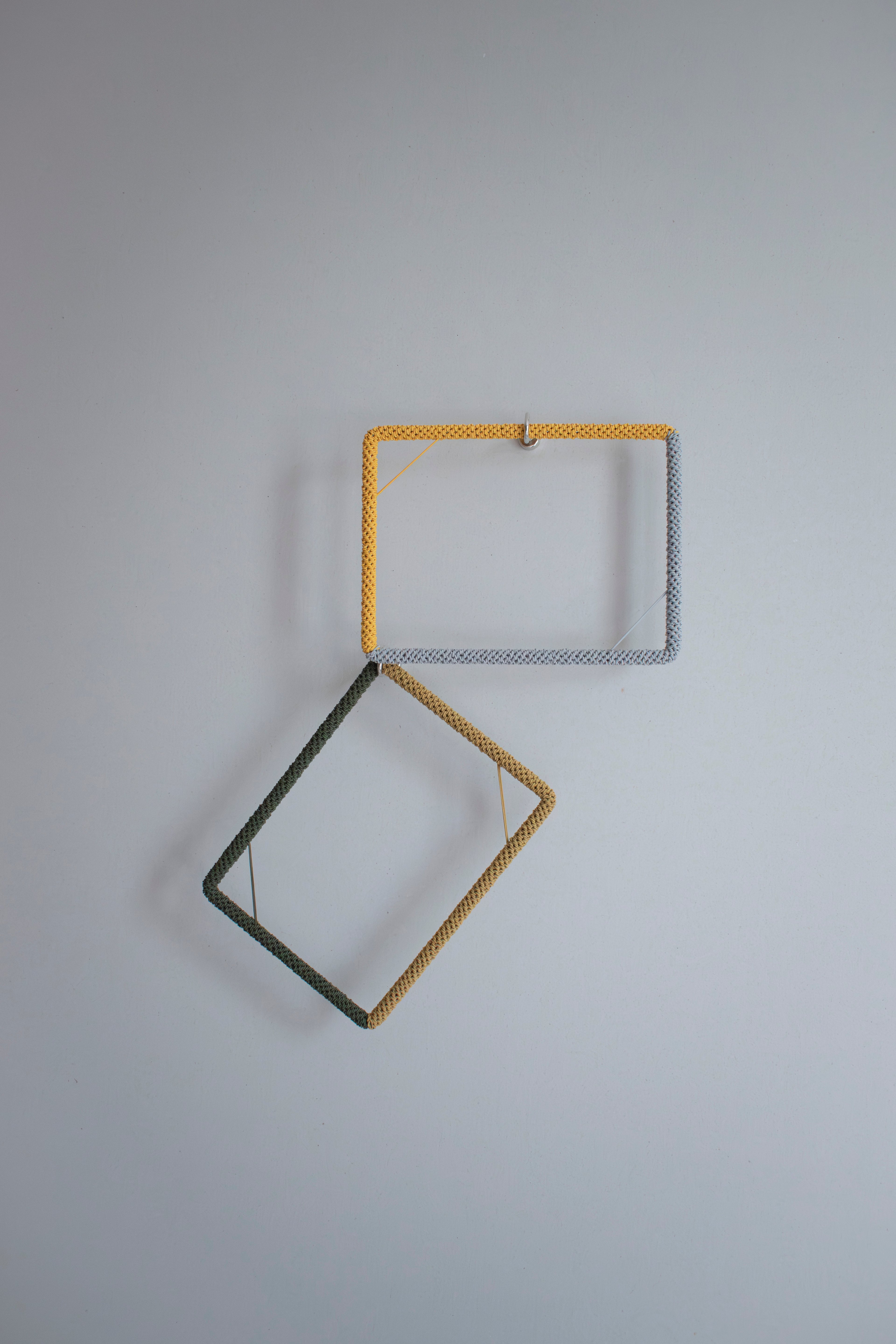 カラフルなコードを金属に編みつけることで、立体的な編み目が冷たい素材に温かい質感を与えます。音楽のように空間にリズムを置くイメージで配色のパターンを変えています。