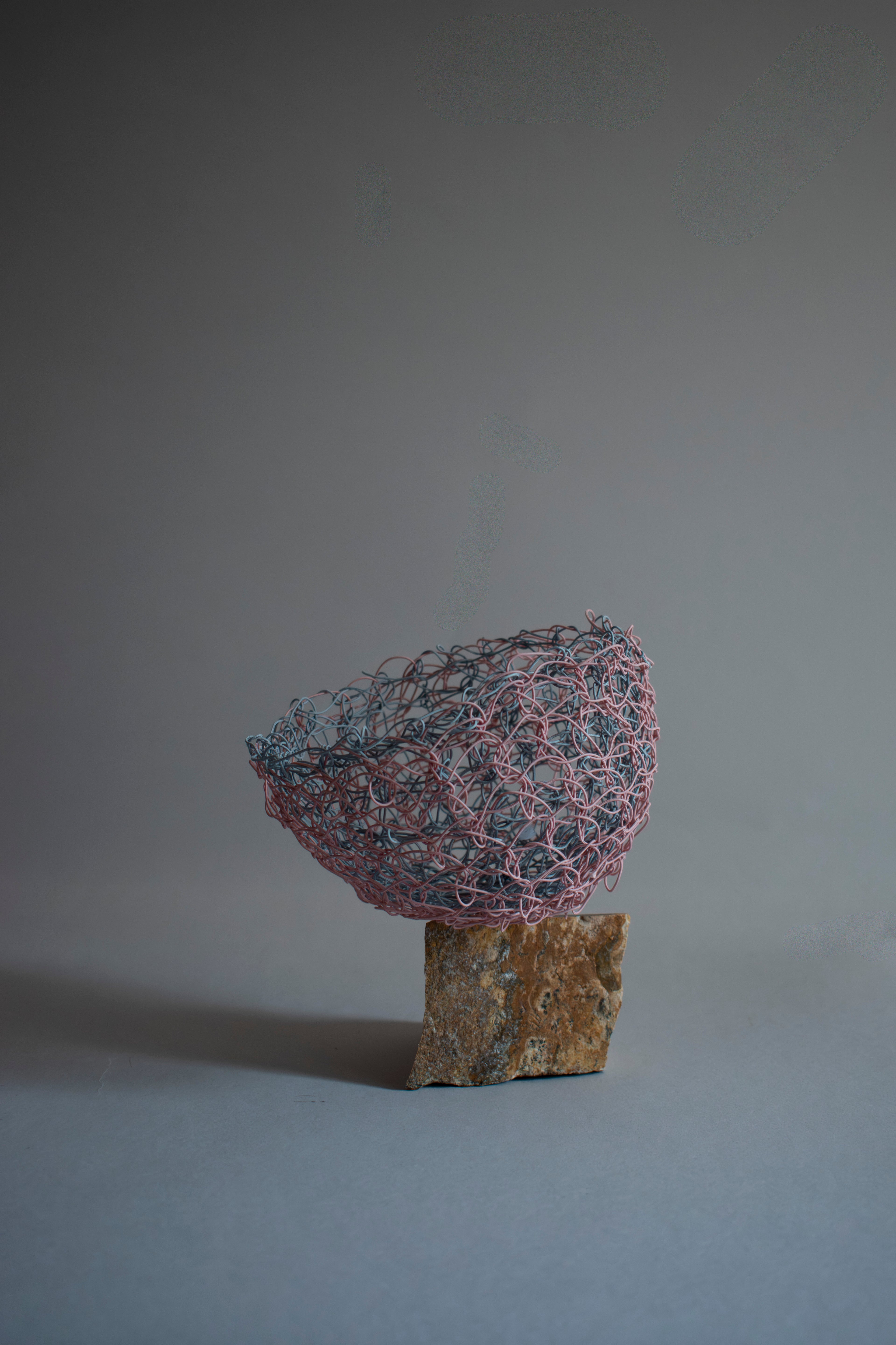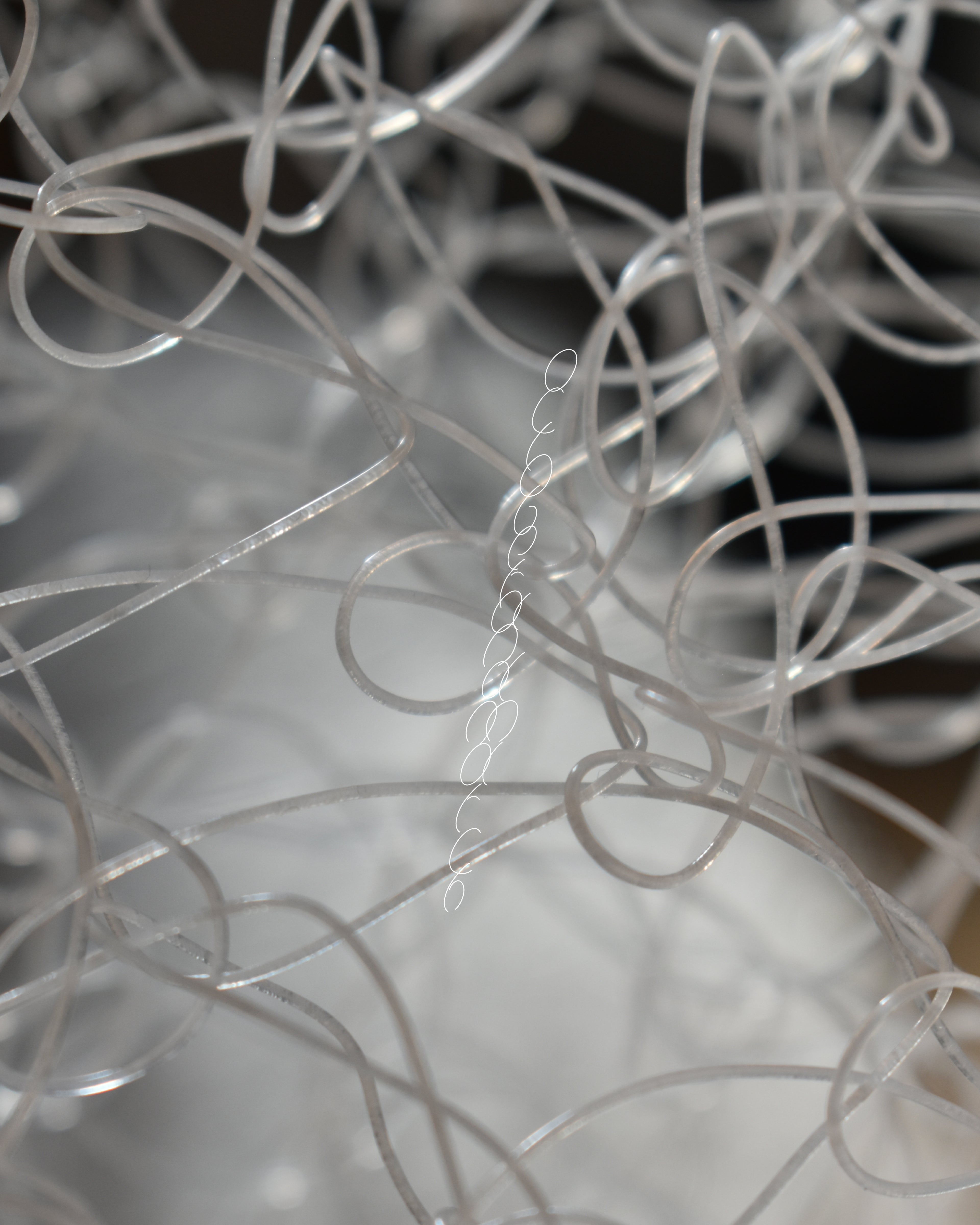 柔らかいコードと硬いコードを引き揃えて編むことで、自立しながら柔らかさを併せ持った構造体となりました。細い線がうねうねと伝う様子は植物のようでもあり、存在感がありながら空間を緩めてくれるような佇まいです。