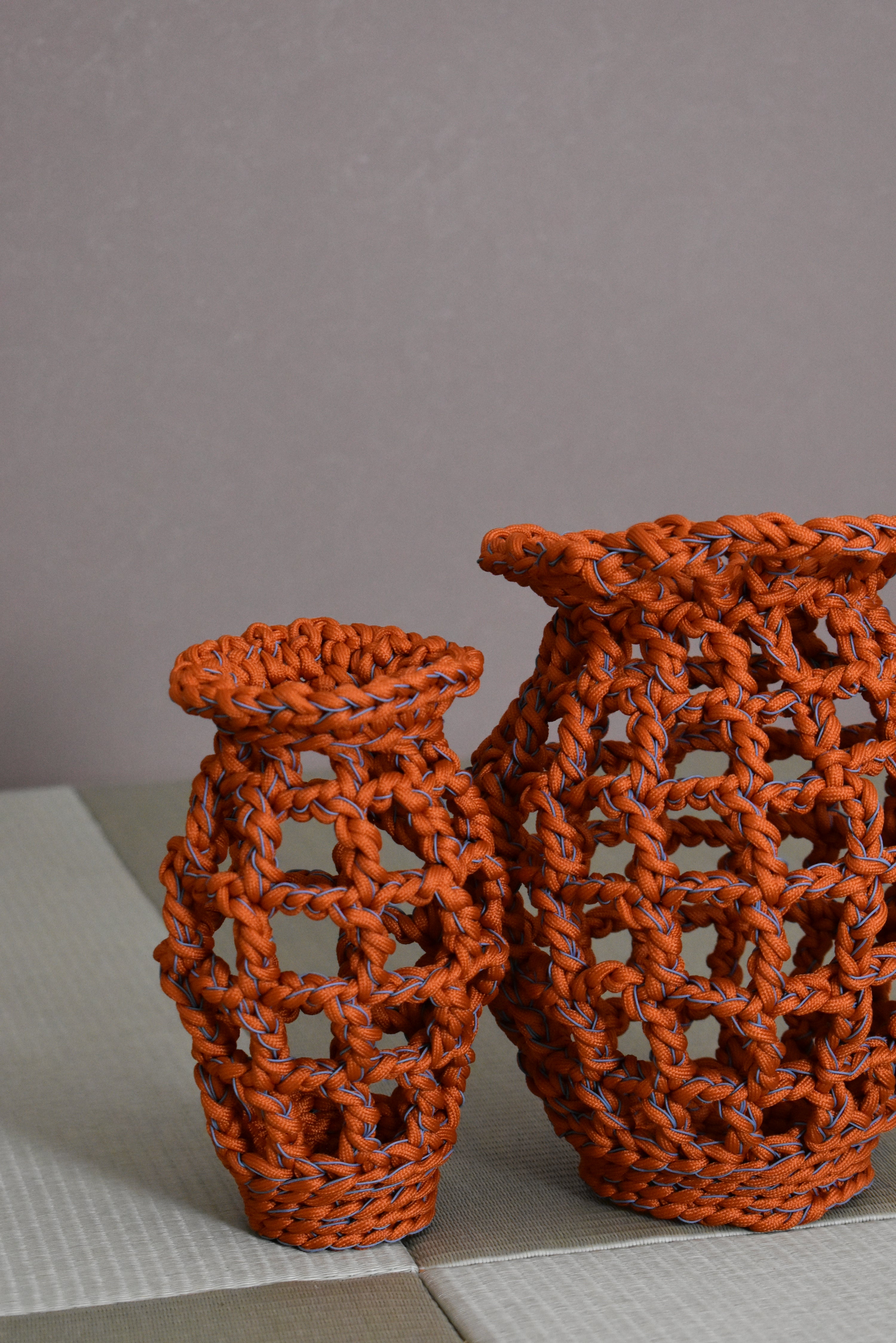 美術館からのご提案で橙色のPOTを編みました。組み合わせる細い線は燻んだ水色を採用しています。
