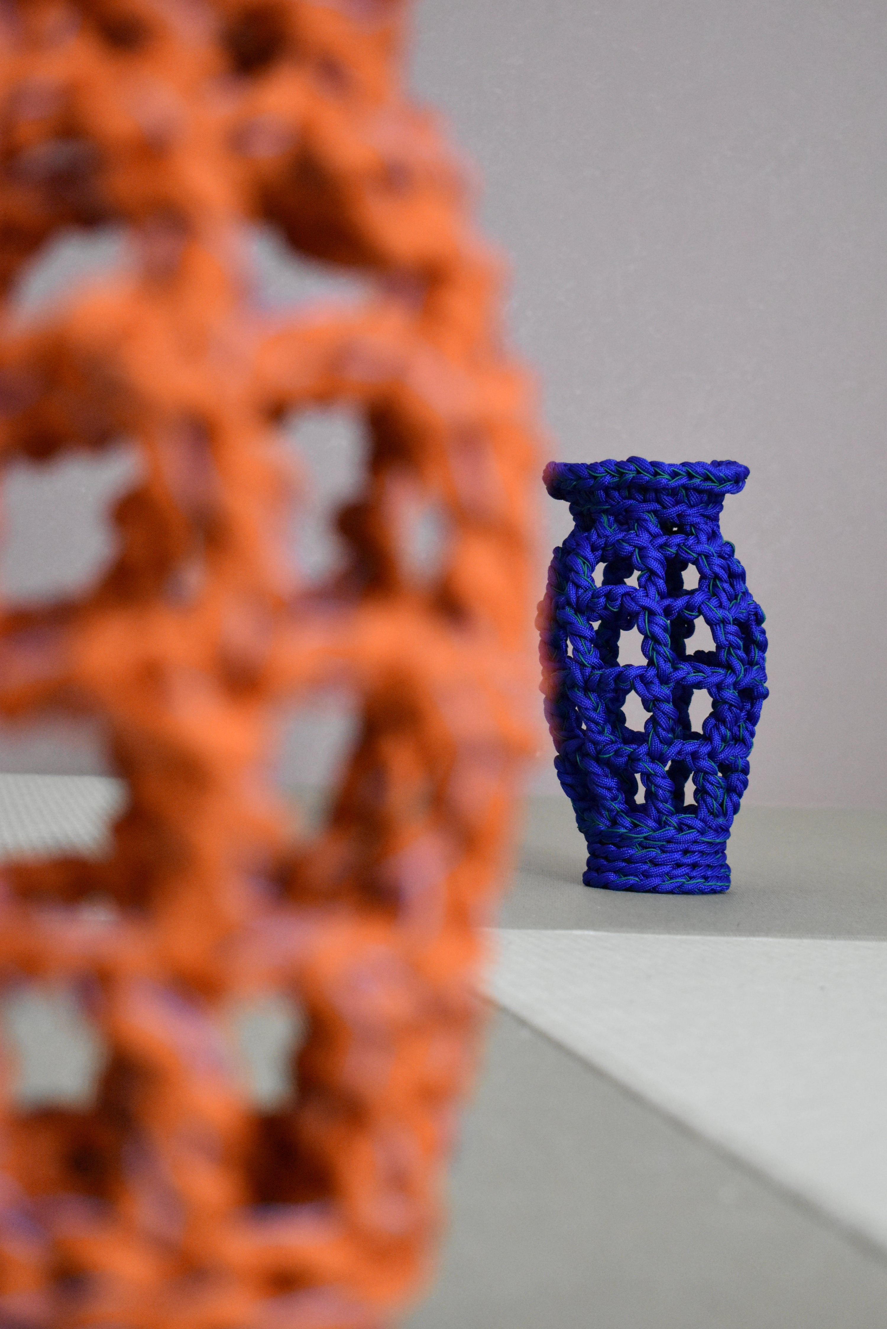 この絡まりの「混沌」を「編み」という秩序に取り込むことで調和しています。帯状に編み、巻物のようにまとめることで重量感と安定感を生み、糸の塊のような花瓶に仕立てました。