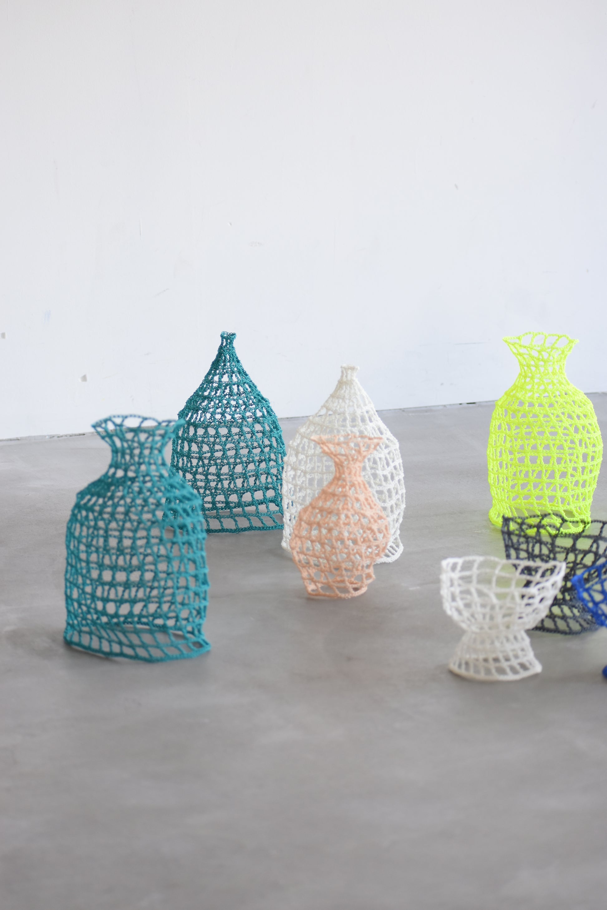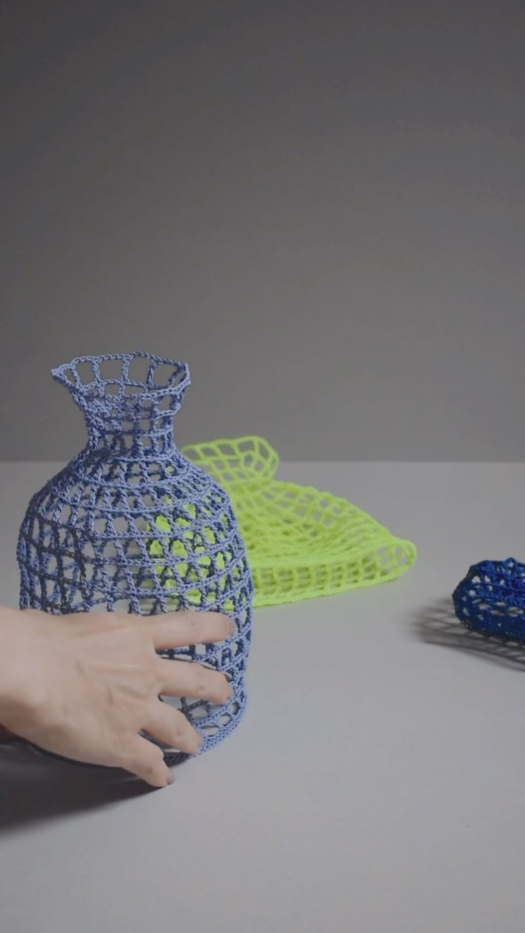 針金のように頑丈なコードを格子状に編みたてることで構造的に自立します。
